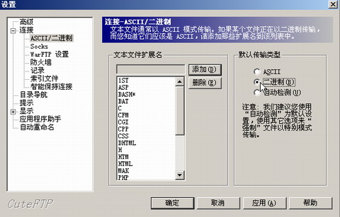 1.如果您采用的是Cuteftp來上傳系統,請參照下圖進行設置:編輯-設置-傳輸類型-二進制,如圖所示:
